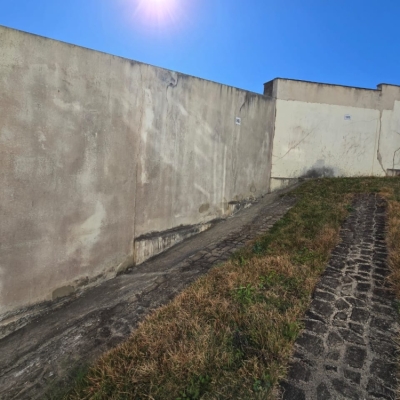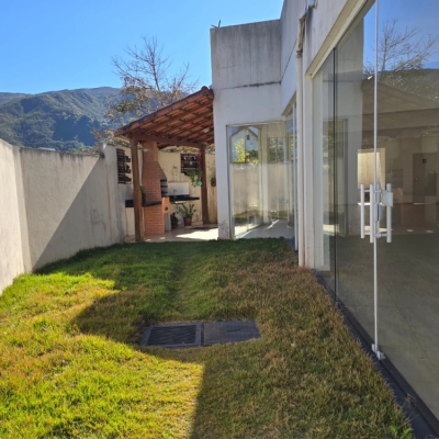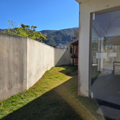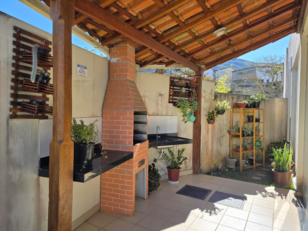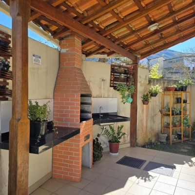 Área de festas com churrasqueira, cozinha, salão, banheiros
