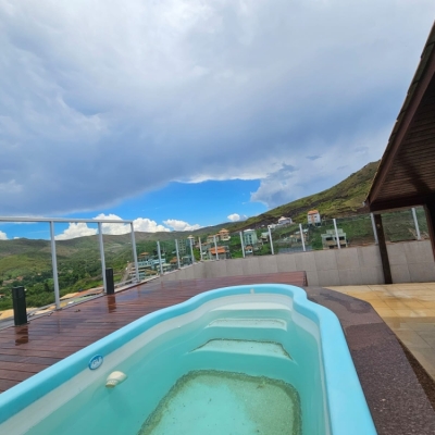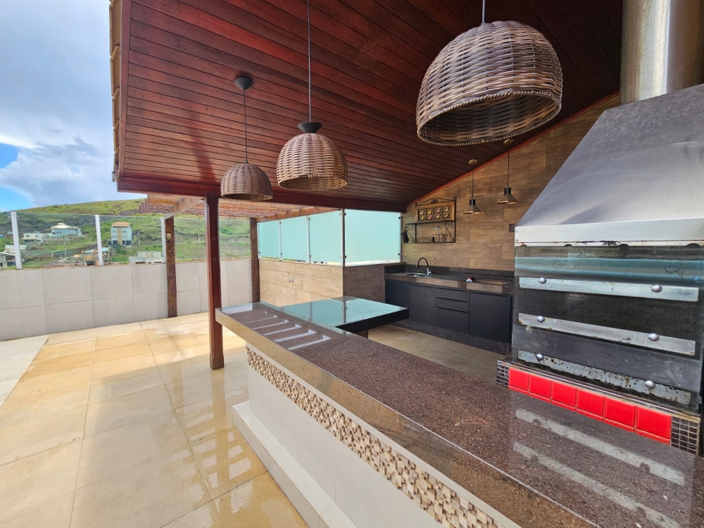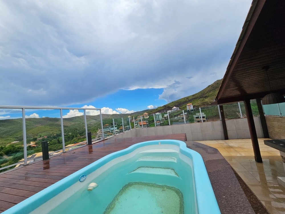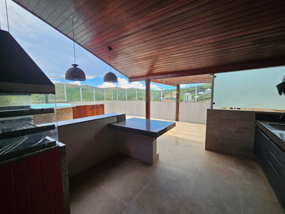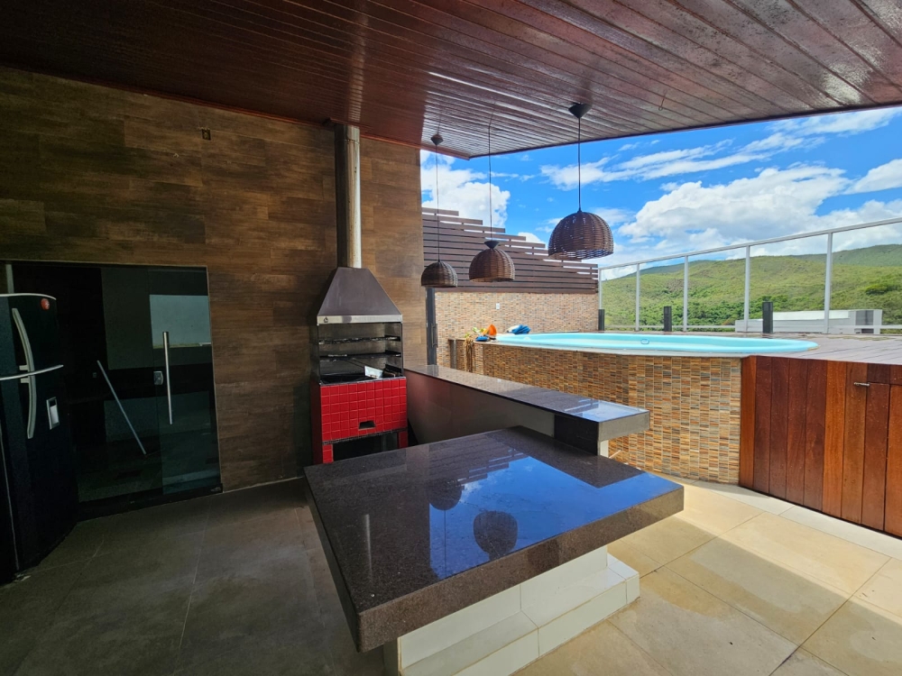 Área Gourmet na cobertura com piscina, churrasqueira, área privativa, banheiro social.